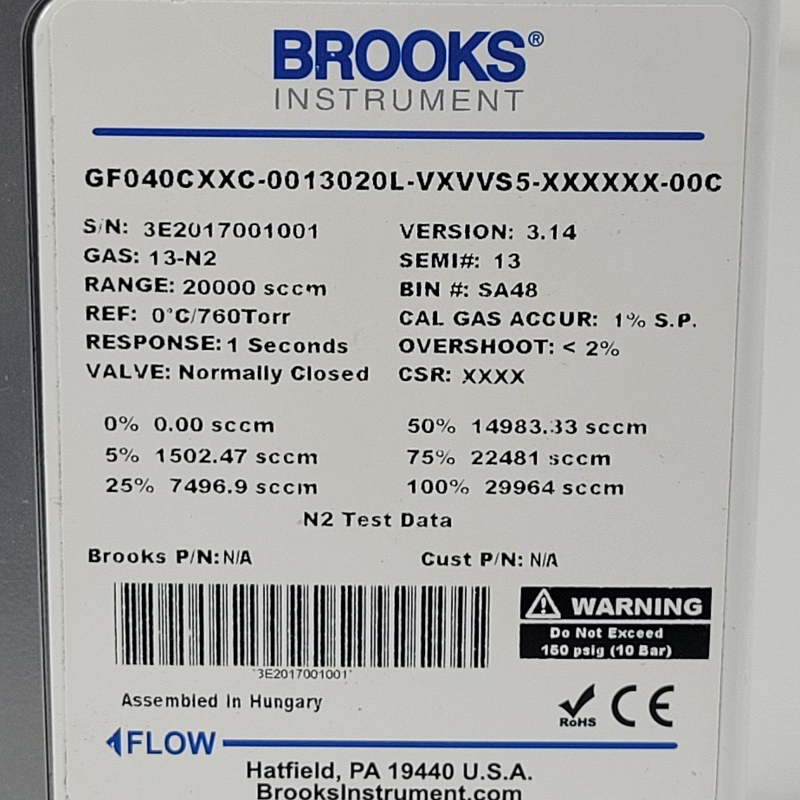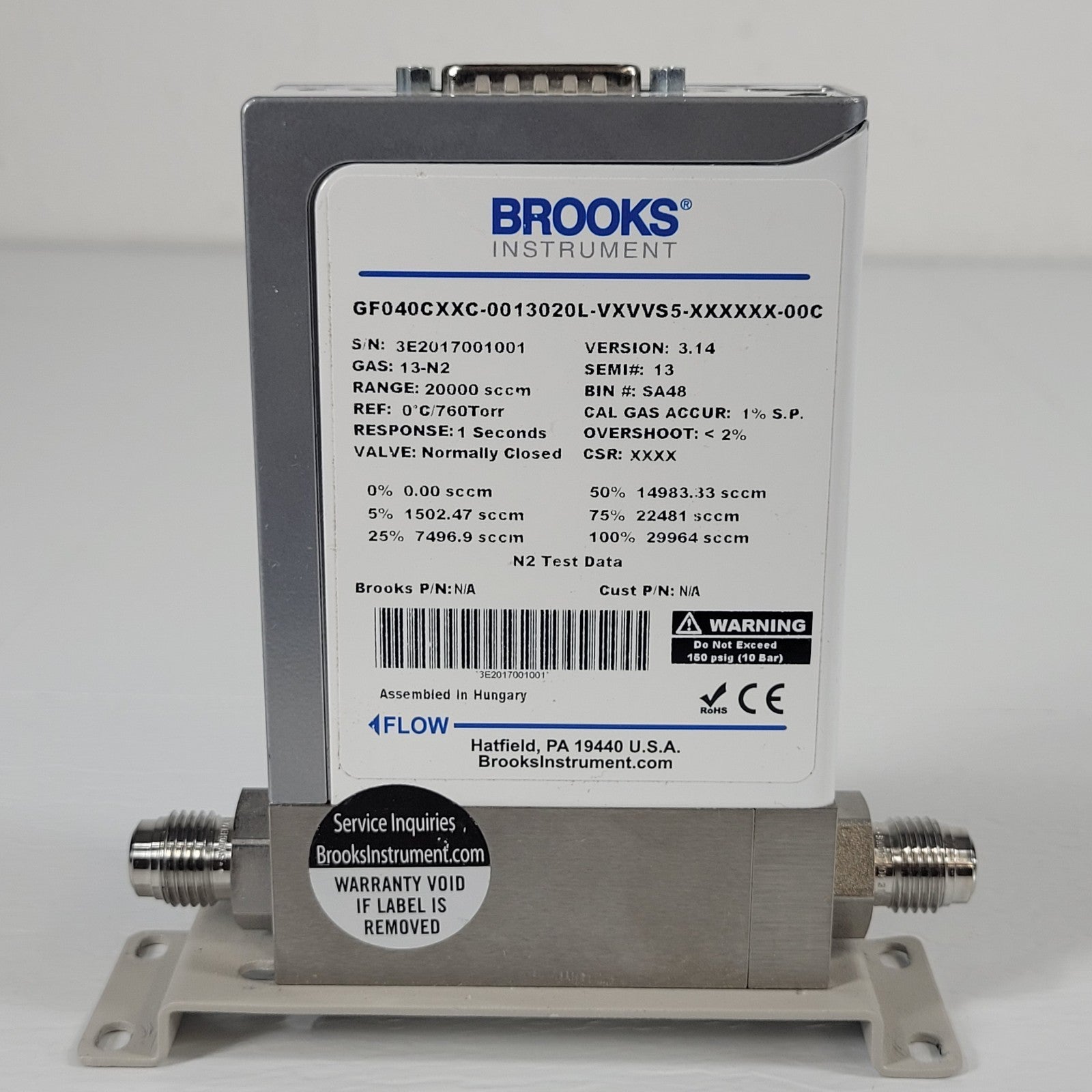 Brooks GF040 0013020L Thermal Mass Flow Controller MFC 13-N2 Nitrogen Gas 20000 sccm 20 SLM Range