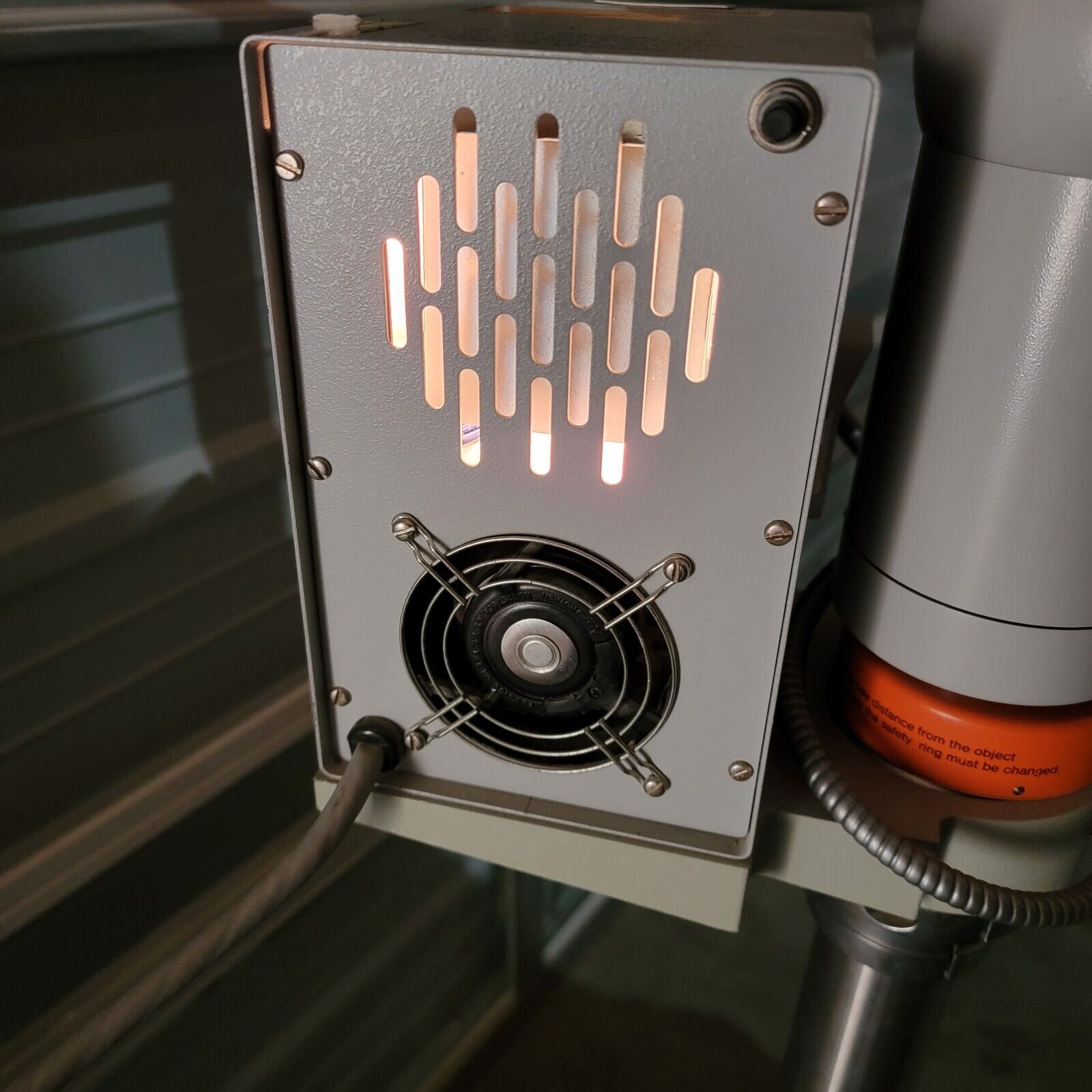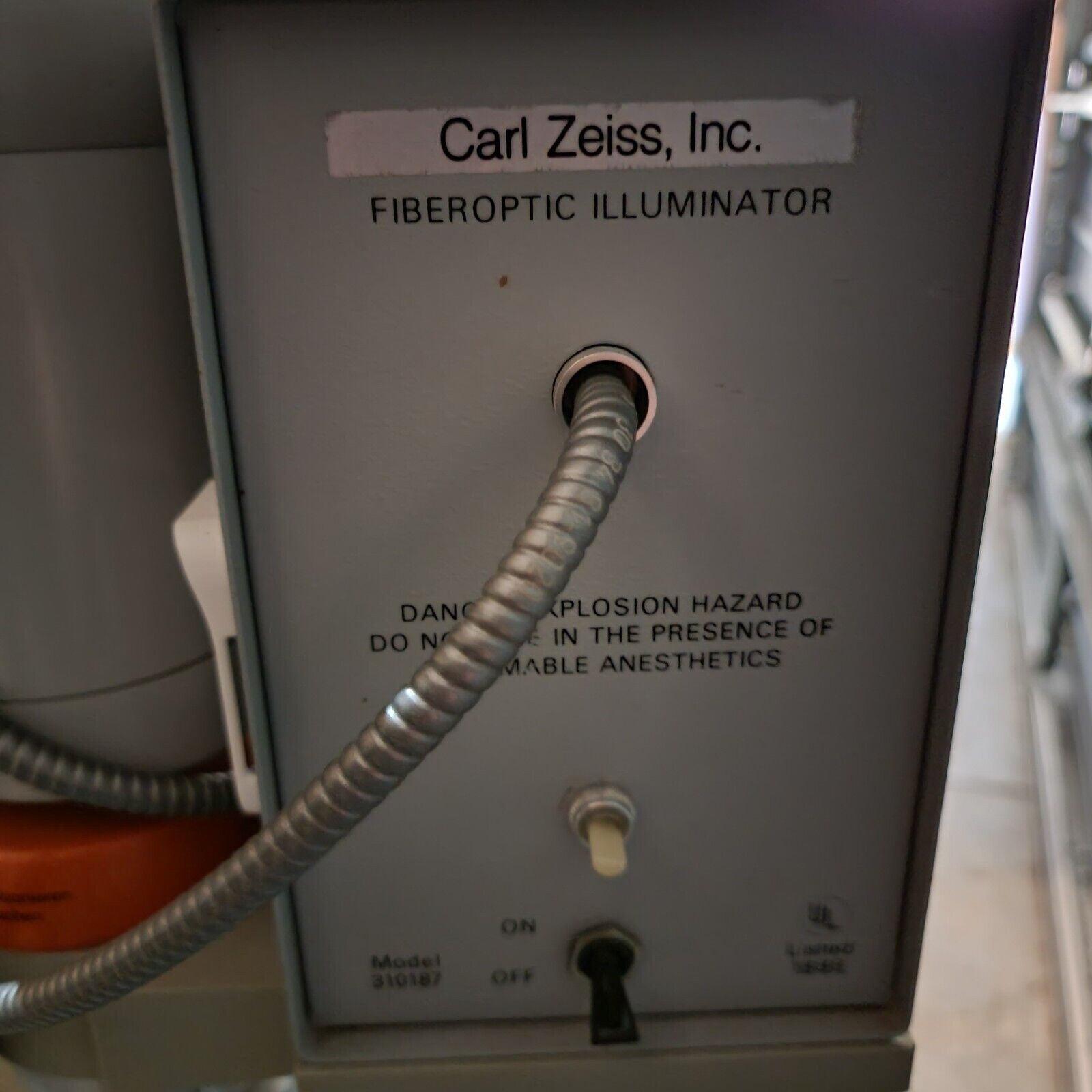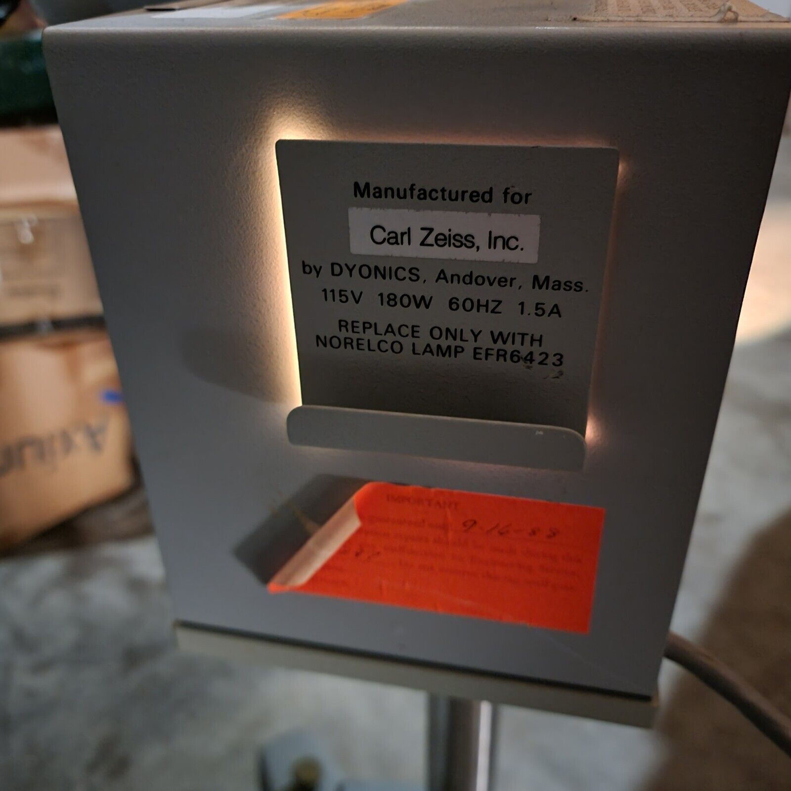 Used, Lamp works well and Optics are clear. Very versatile, has 12.5x eyepieces and an adjustable 0.4x-2.5x objective lens. Has a floor-mount stand with lockable castor wheels, is height adjustable and able to easily move. Fiber Optic light moves with it, and the light powers on and works well (115v power needed). See photos.