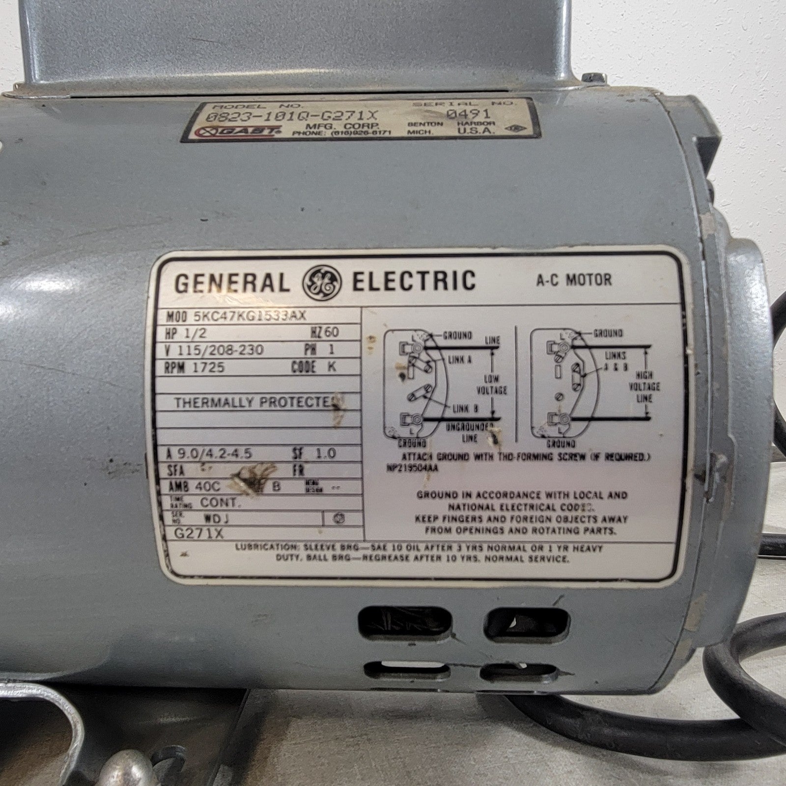 Gast 0823-101Q-G271X Vacuum Pump Compressor AC Motor GE 5KC47KG1533AX 1-Ph 120V