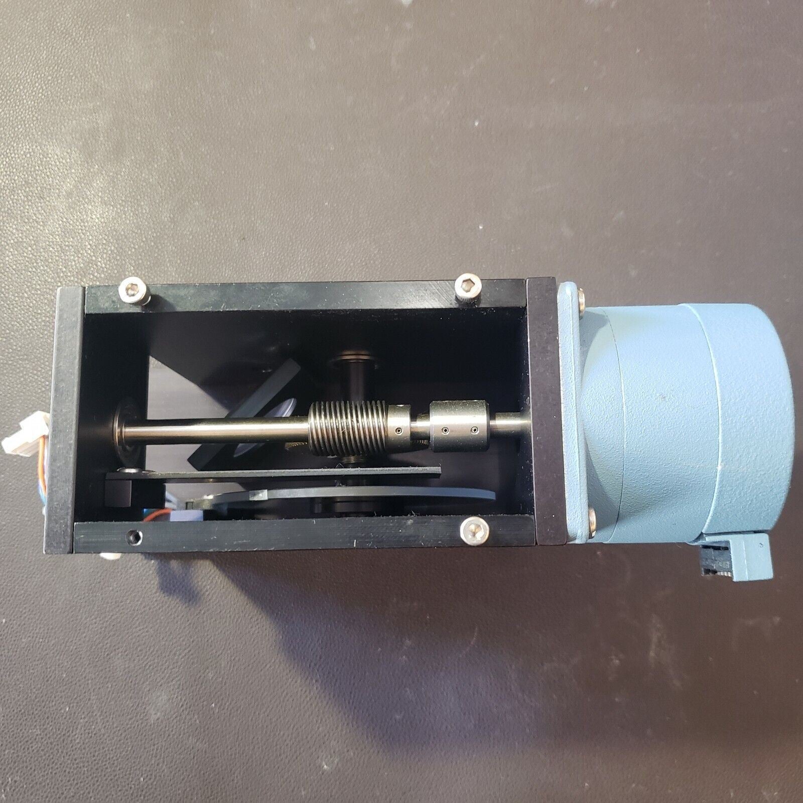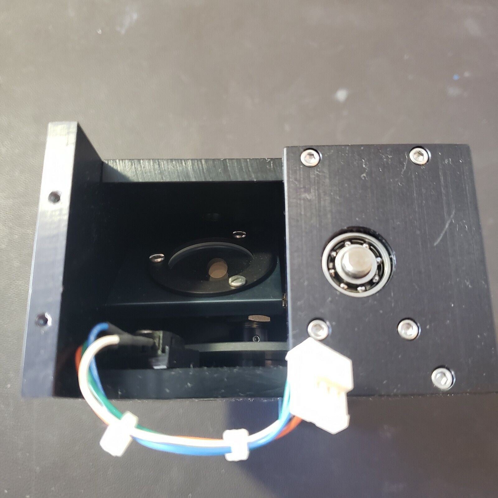 This system has one light input and two light outputs. Depending on the location of the motor-driven polarizer, light will go one direction or the other.