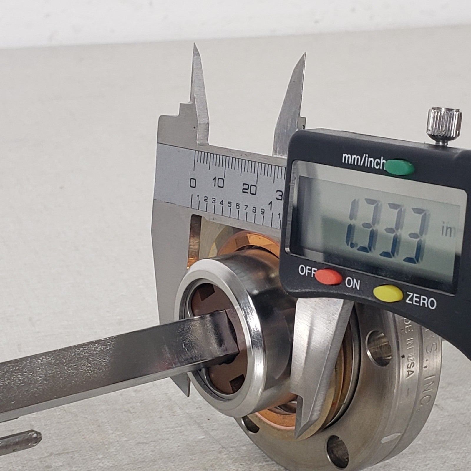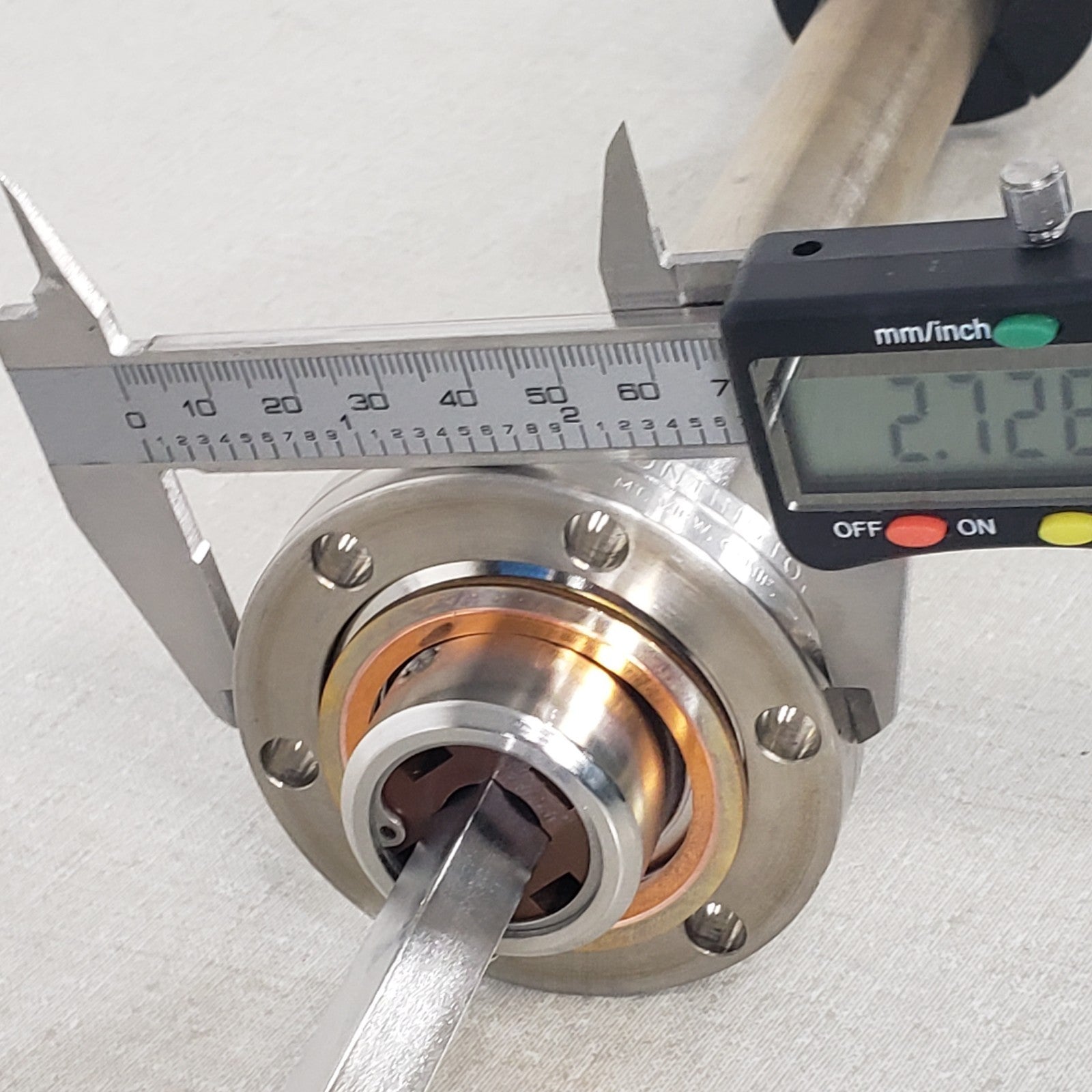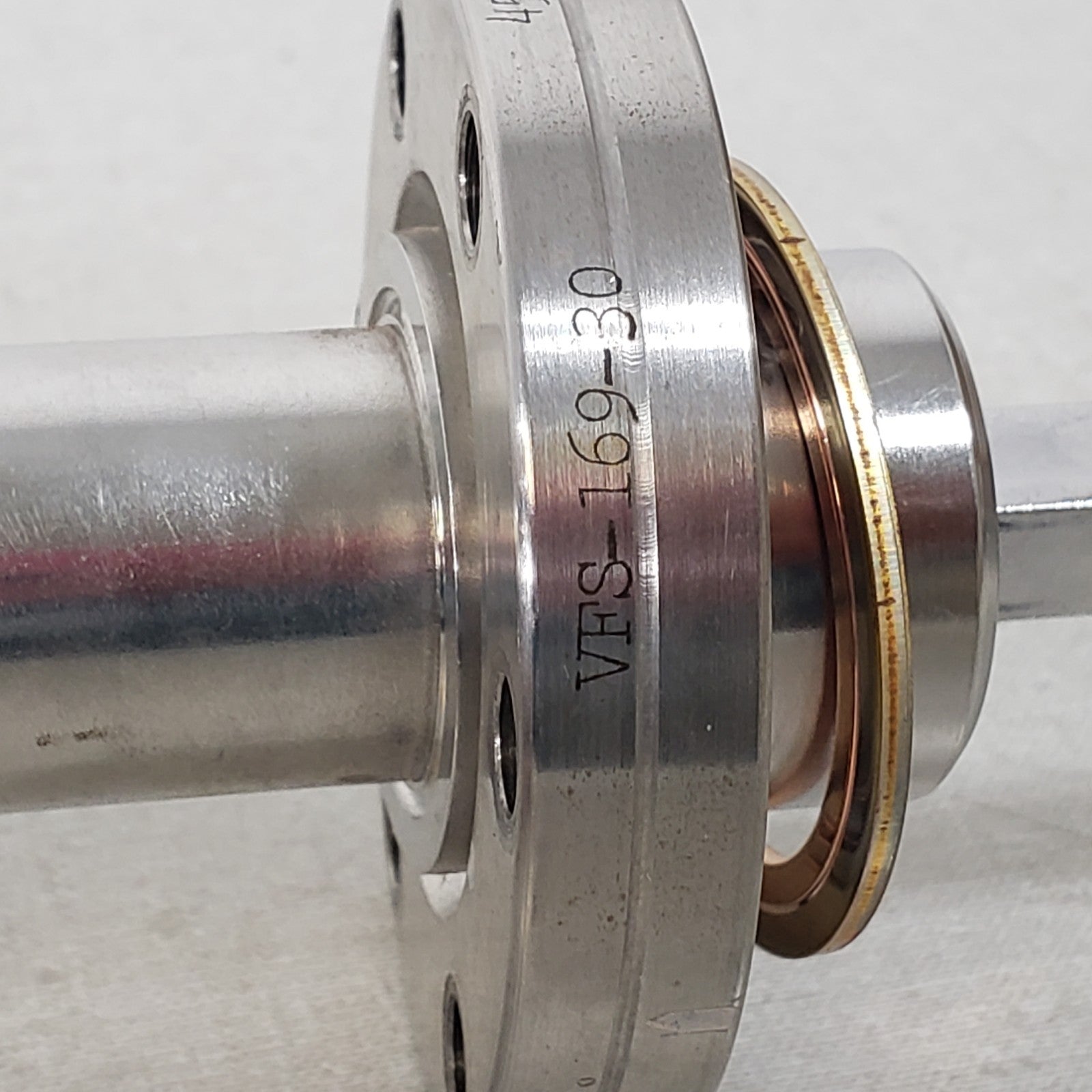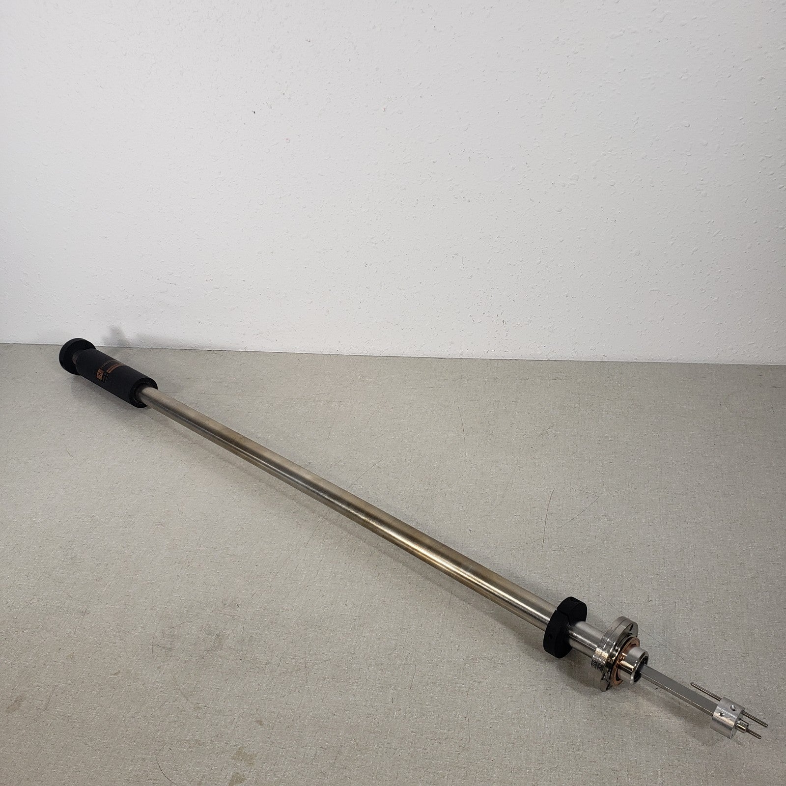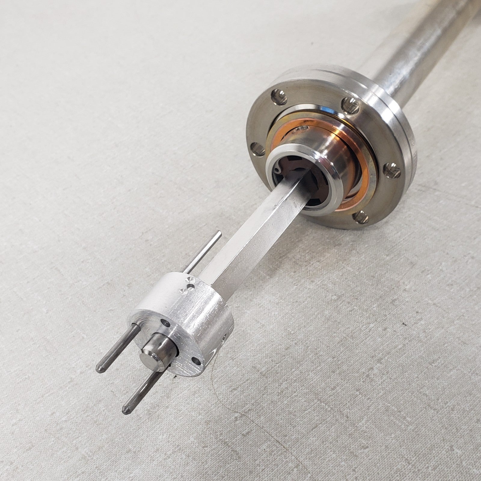 Conflat knife edge is free of any dents or dings, holds high vacuum well. 3/8" solid square shaft in the center. Total movement stroke of 30".