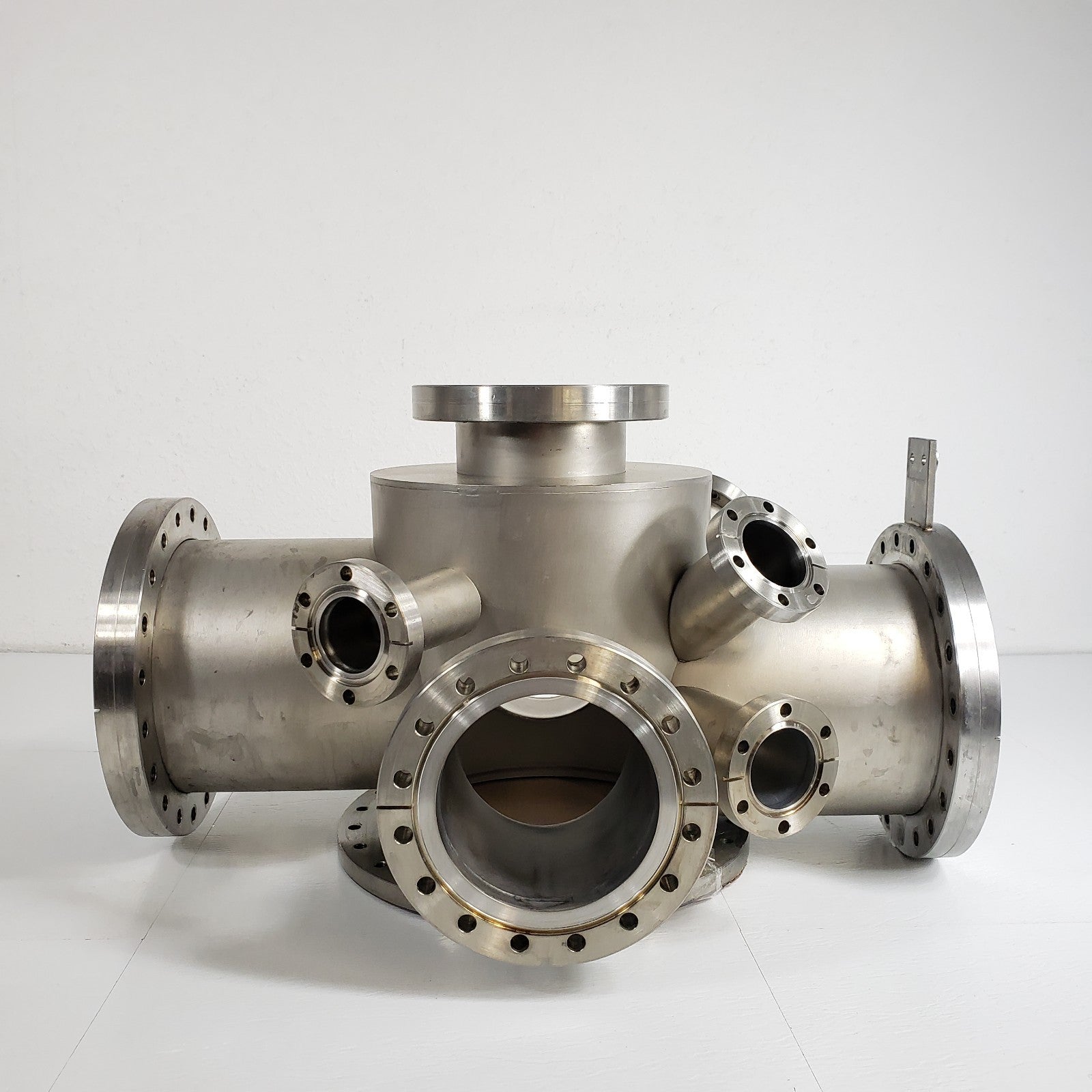 See photos for the configuration of the flanges. All have good-condition knife edges and hold UHV vacuum levels.