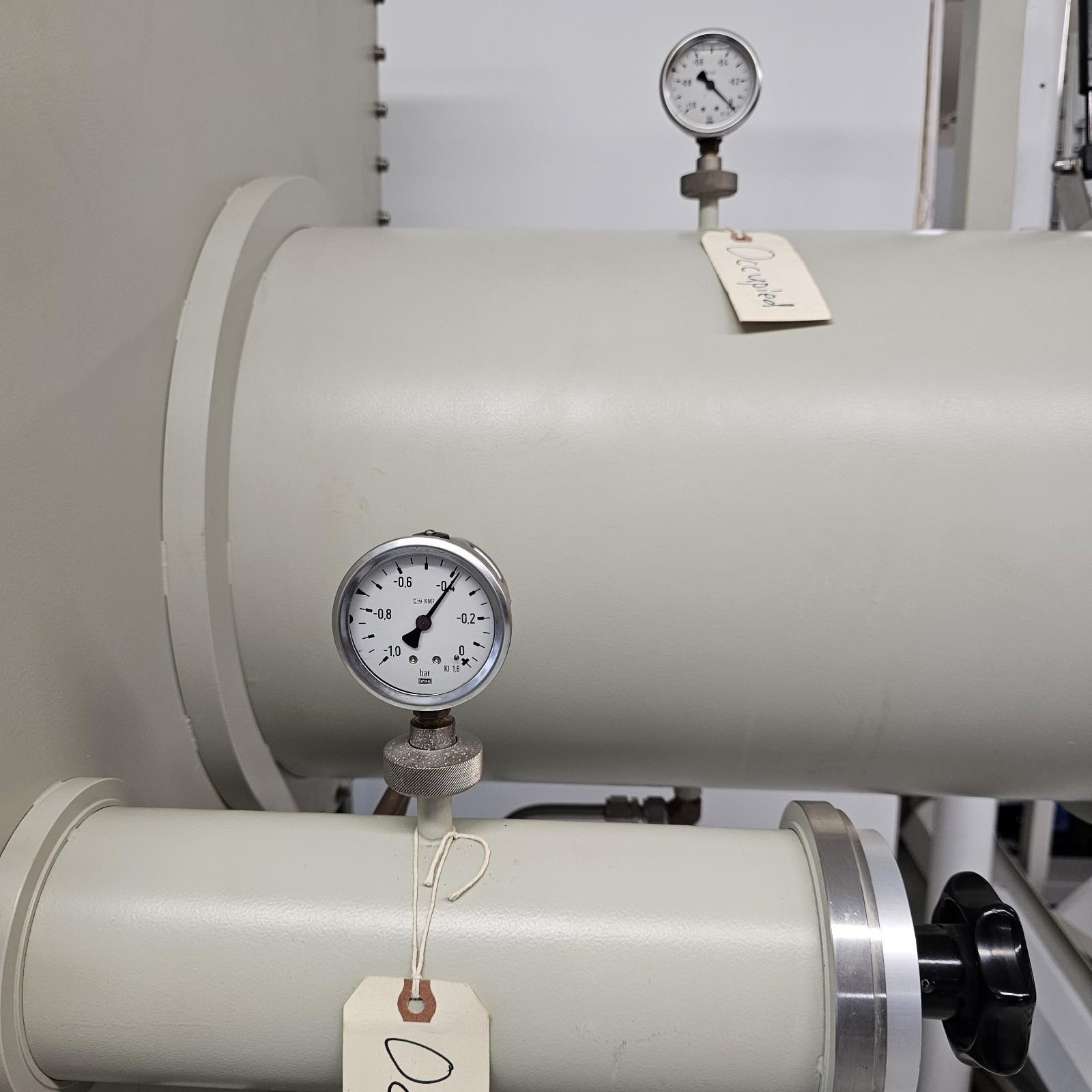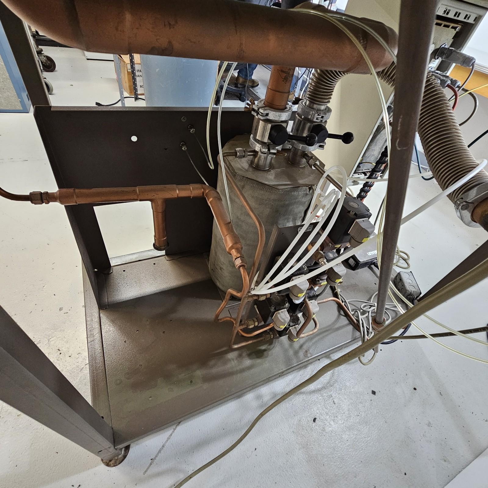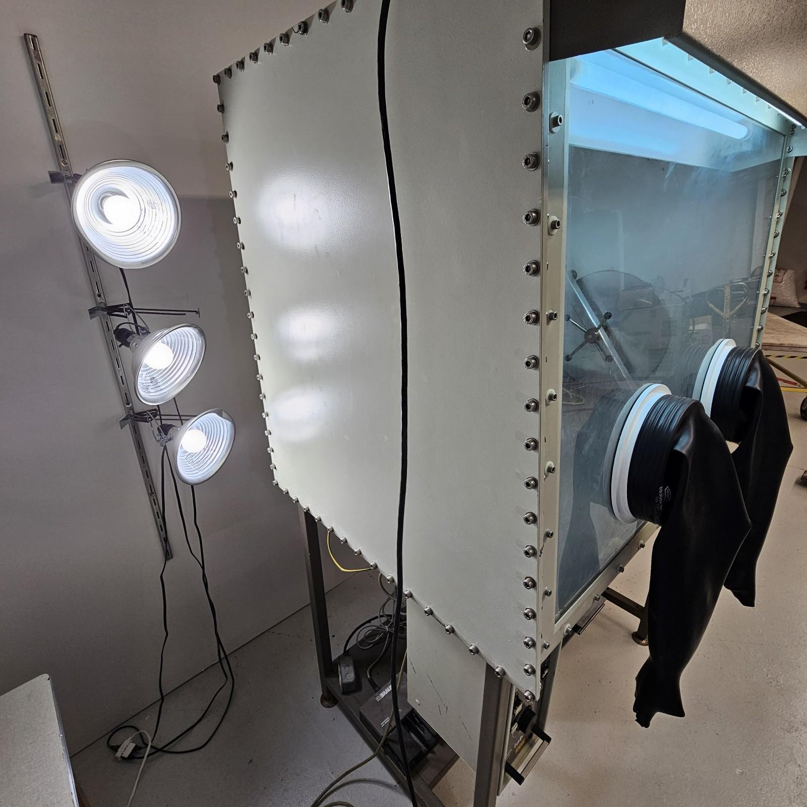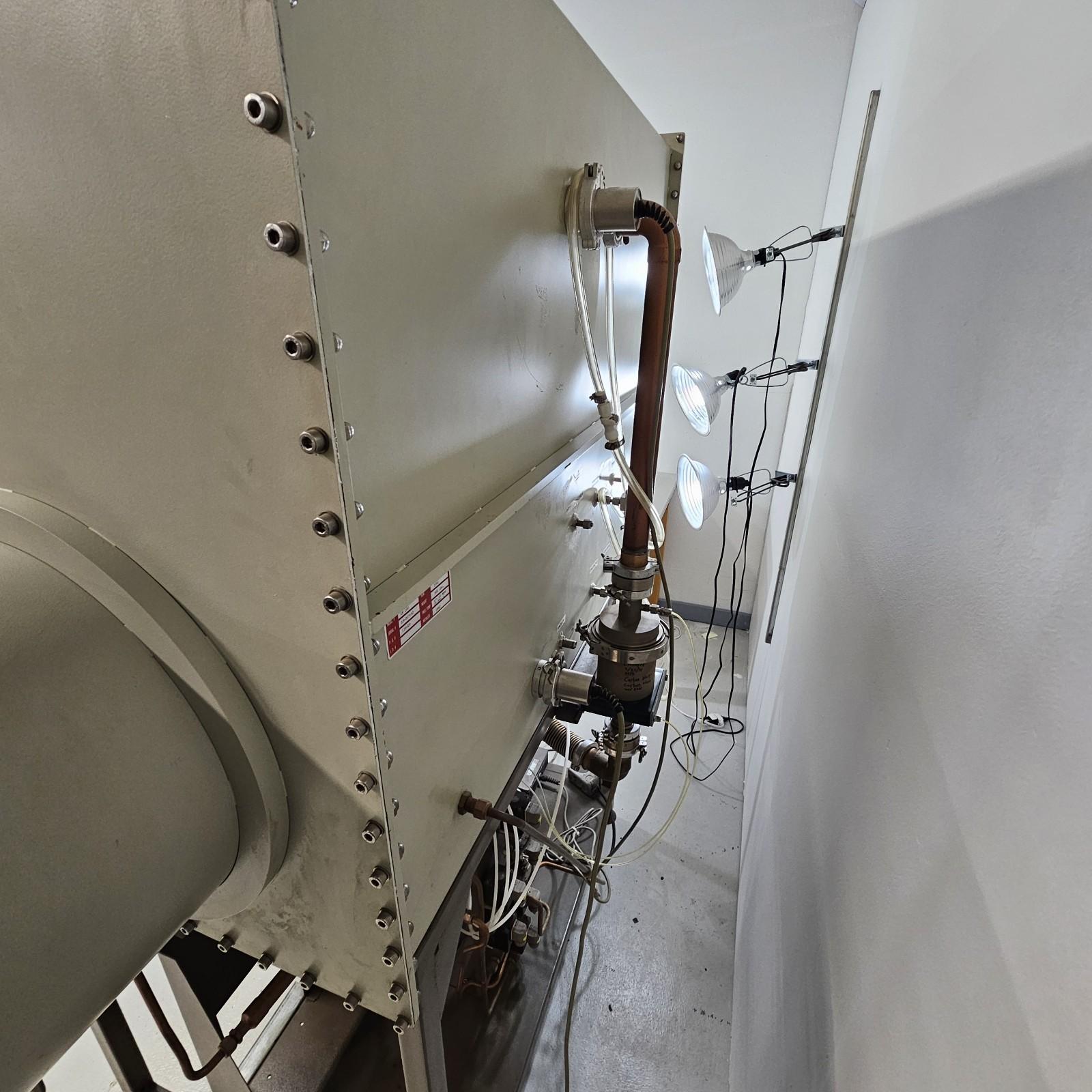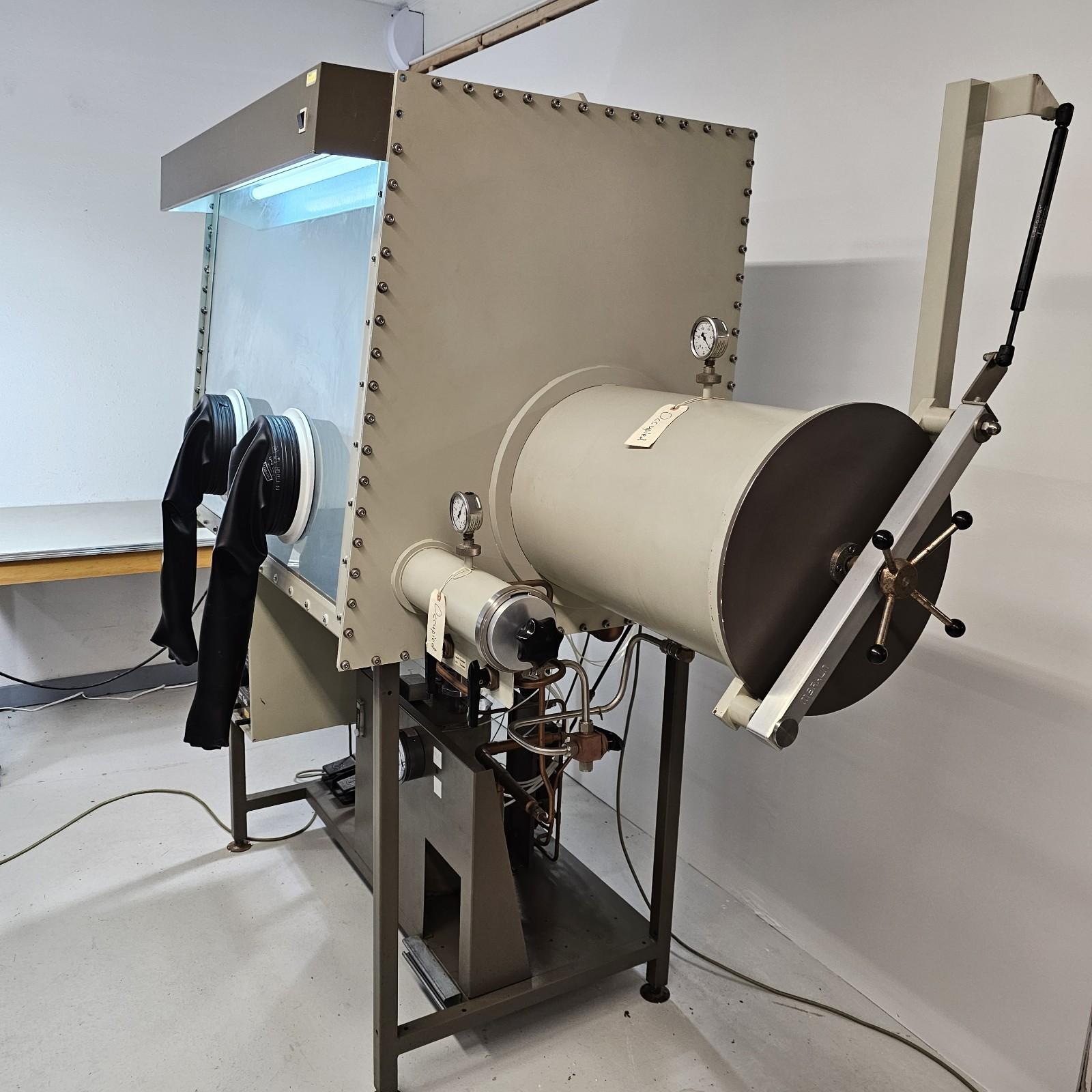 Some functions have been tested and work. Regeneration cycles work (solenoids all click when settings are rotated through): heating, purging, evacuation, and cooling functions. Blower circulator fan works, we just rebuilt the blower so that it has new bearings and rotor. Light fixture works. High and low pressure set points work. The catalyst was last replaced in 2020 (it at least needs a regen cycle if not full catalyst replacement)- it has been kept sealed with the butterfly valves on the catalyst chamber, but it is unknown if those are leak-tight. The system has not been fully tested or leak-checked since we do not have pure N2 at our facility. System has been thoroughly cleaned. Has two KF electrical power port feedthroughs - one runs the blower and one is for auxiliary power for any systems that you may want to run in the box itself (centrifuges, sonicators, lights, etc). The pressure gauge to the small antechamber is stuck and will either need to be replaced or will need some cleaning and repair.