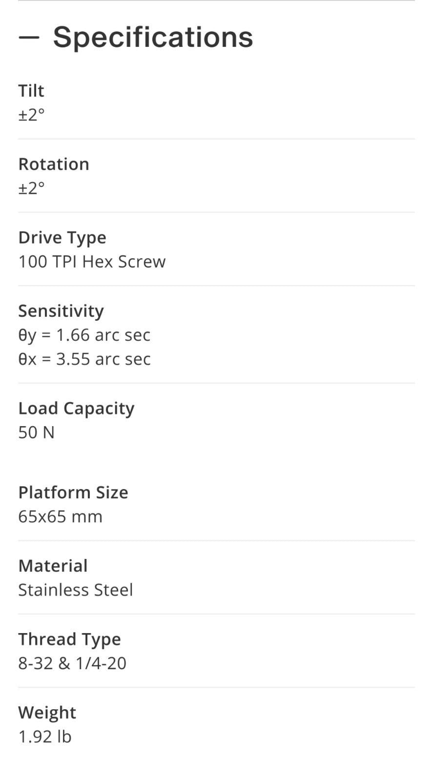 "Tilt Platform, Two-Axis, 65 x 65 mm Platform, 8-32 & 1/4-20