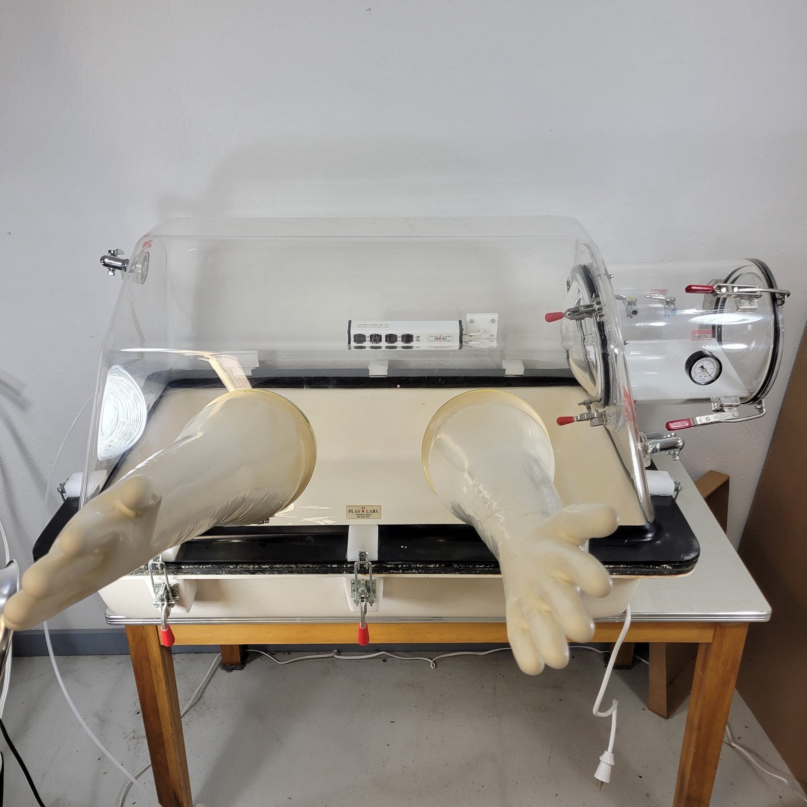 From the manufacturer: "The Plas-Labs 818-GB is a basic glove box designed for general laboratory isolation applications in various settings, including chemical, pharmaceutical, and biotech labs. It's also suitable for use in waste management laboratories and cleanroom facilities. It is a compact, portable, and lightweight model suitable for isolating sensitive research materials from the external environment.