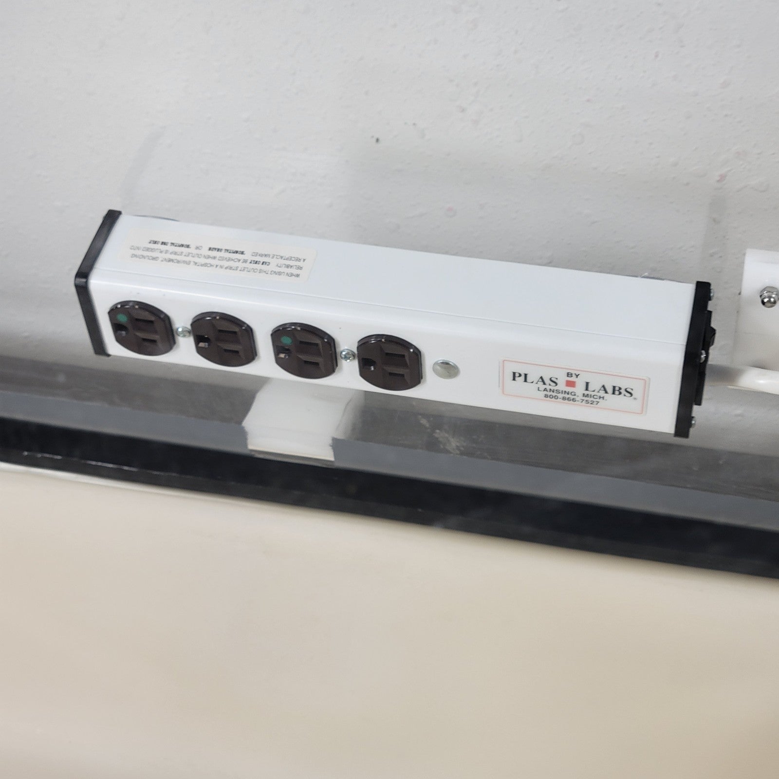 The Plas-Labs 818-GB features an optically clear, one-piece acrylic top and a matched die-molded thermoset bottom. It includes coved, easy-to-clean corners and a double-layered neoprene gasketing system for an airtight seal. The glove box comes with ambidextrous, white Hypalon gloves and stainless steel O-rings. It also has a transparent transfer chamber with an adjustable vacuum gauge, four ground key cock valves for purging, a white leveling tray, and adjustable clamps. The unit is equipped with a hospital-grade electrical outlet strip."