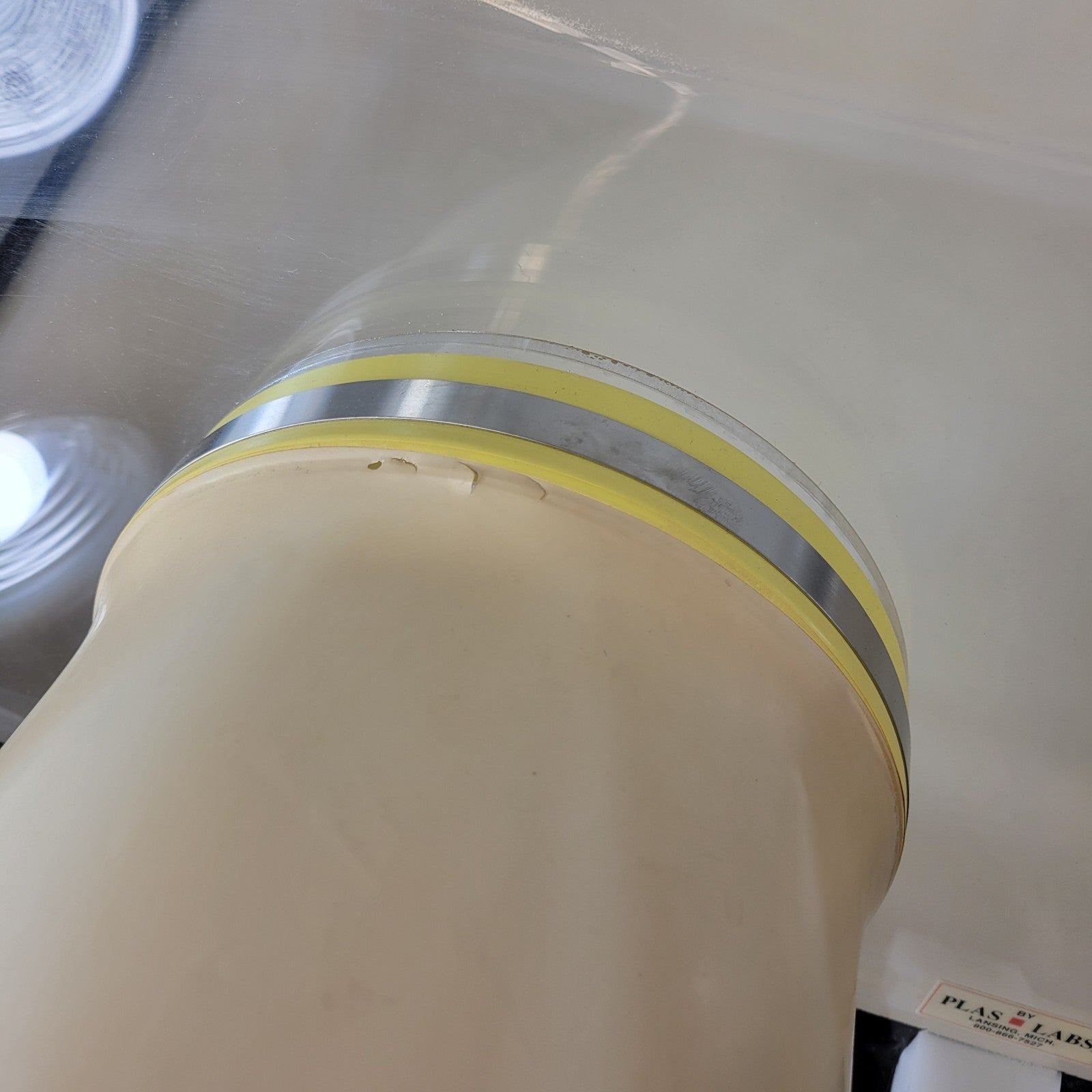 Used see photos. Tested holds okay pressure but has some small tears in the rubber where the gloves attach around the flange. May need new gloves, or the gloves can be taped and it will hold pressure just fine again. In the first photo we connected our in-house nitrogen to test it and it performed well.