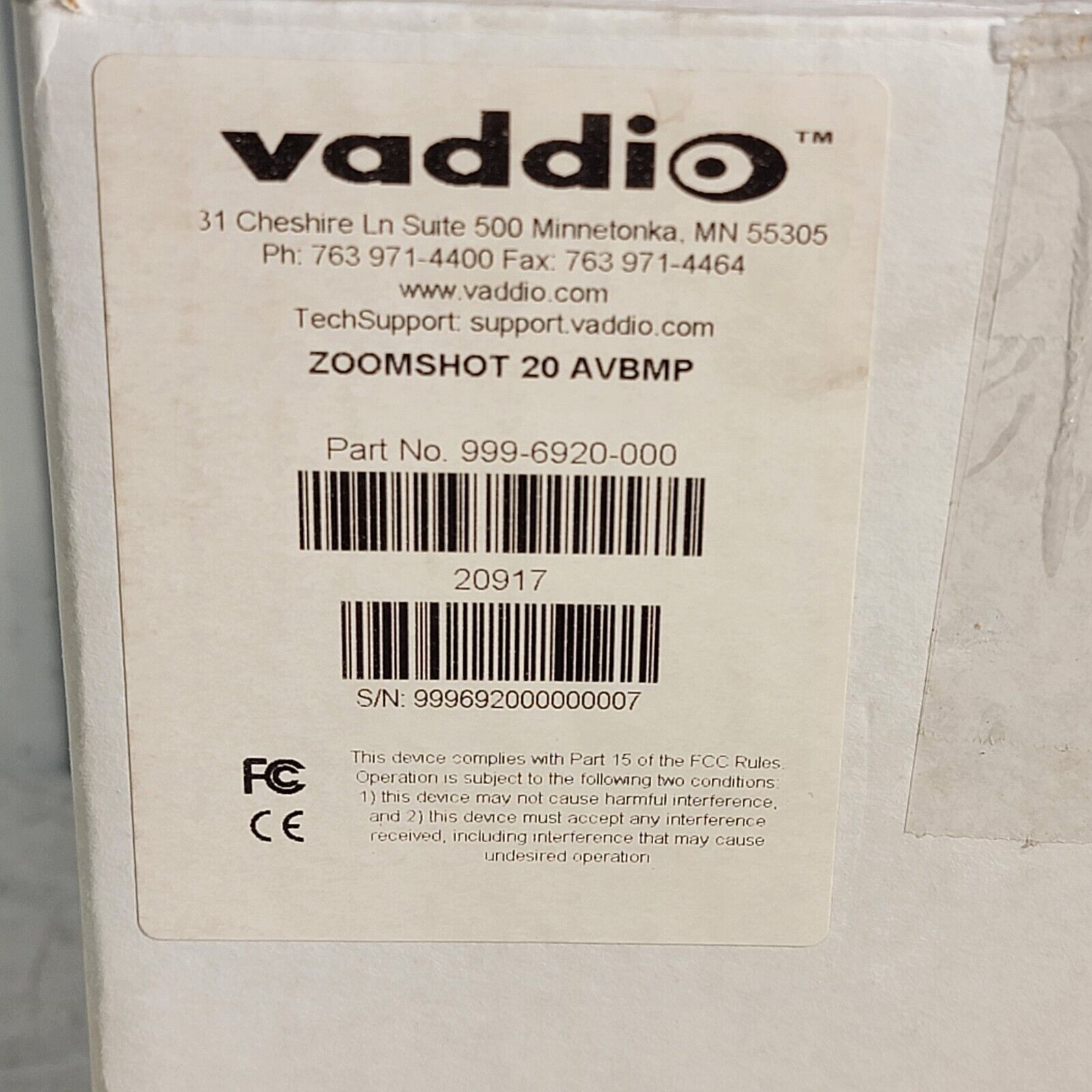 VADDIO ZoomShot 20 HD Point of View Video Camera w/ Remote 20-998-6920-000