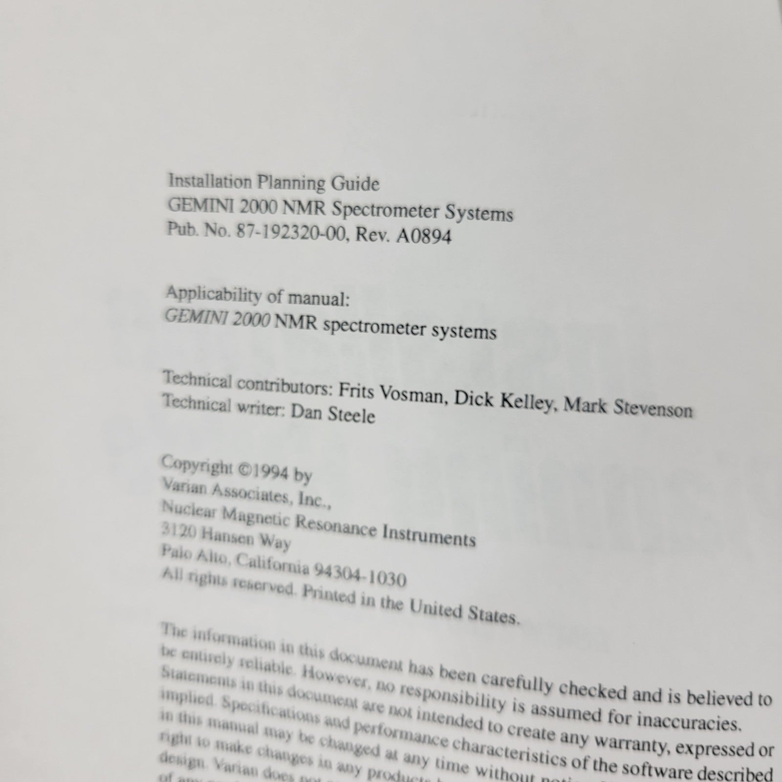 Installation Planning Guide for Gemini 2000 NMR Spectrometer Systems (1994)